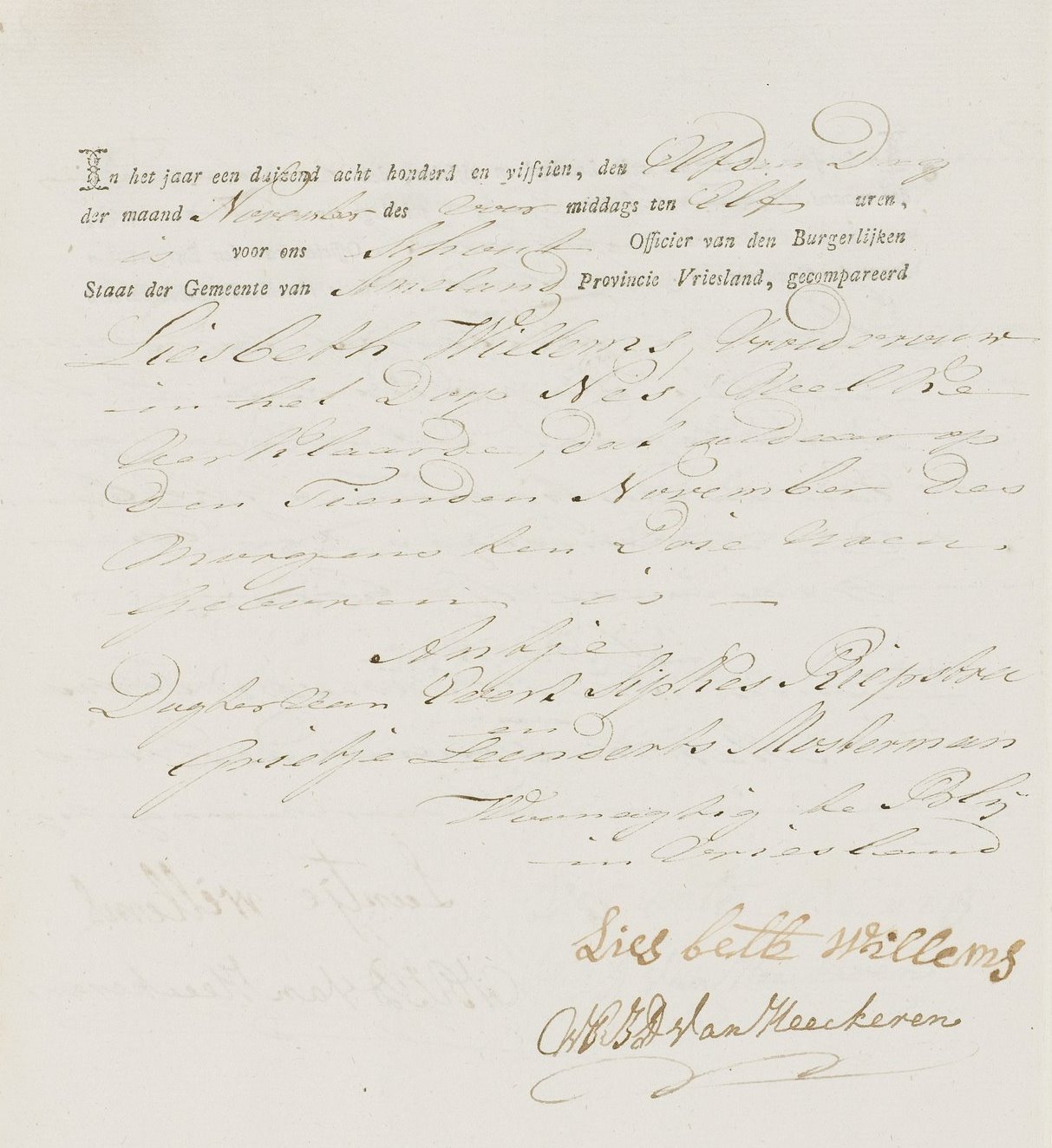 | Tekst | hoofdpersoonnaam=Antje Riepstra hoofdpersoongeslacht=Vrouw hoofdpersoongebdatum=vrijdag 10 november 1815 hoofdpersoongebplaats=Ameland hoofdpersoonvader=Evert Sipkes Riepstra hoofdpersoonmoeder=Grietje Leenderts Mosterman gebeurtenis=Geboorte aktedatum=11 november 1815 akteplaats=Ameland erfgoedinstelling=Tresoar pagina=25 brontype=BS Geboorte Instellingsplaats=Leeuwarden Collectiegebied=Friesland | |